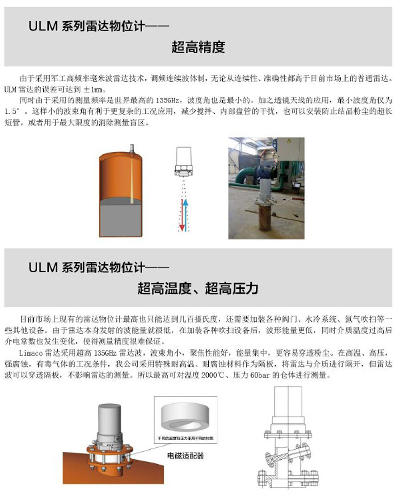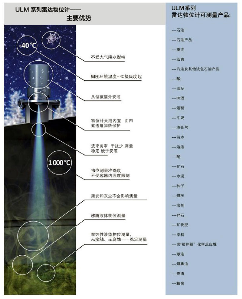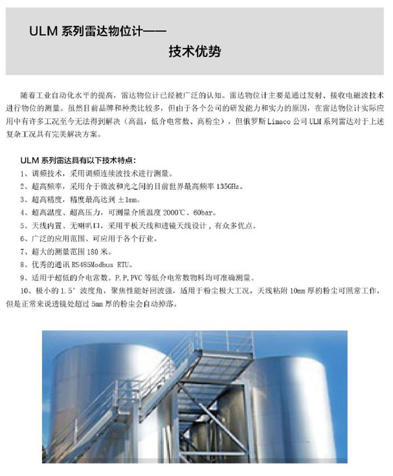 ULM 系列物位計(jì)適用于在各種復(fù)雜工況下的物位的測(cè)量,利馬克公司將會(huì)根據(jù)您的項(xiàng)目特點(diǎn)、工況和技術(shù)要求為您推薦和選擇最適合的雷達(dá)物位計(jì)和測(cè)量方法。