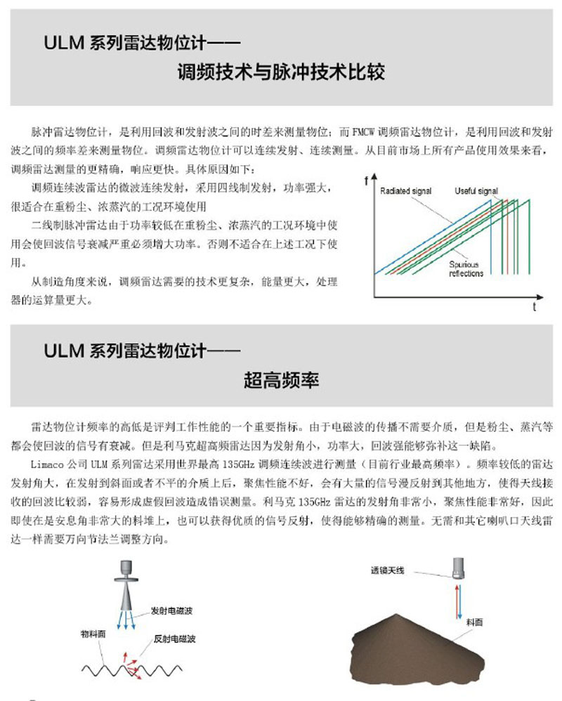 ULM 系列產(chǎn)品是根據(jù)線性頻率掃描調(diào)節(jié)原理設(shè)計(jì)的調(diào)頻連續(xù)波(FMCW)物位測(cè)量?jī)x表,可以在回波反射極弱的條件下識(shí)別和檢測(cè)到反射信號(hào),從而保證液位計(jì)的高靈敏度和可靠、精確的液位測(cè)量。